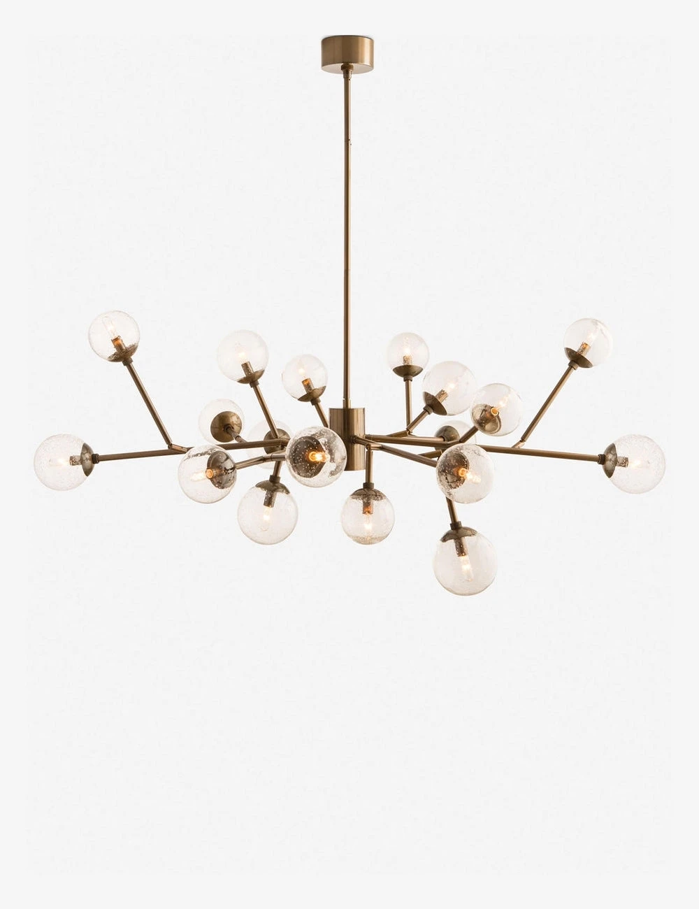 An extended profile and twelve angular arms make this chandelier perfect for a grand lighting statement over a dining room table or open-plan living space. The steel body and glass globes come together in a bright and polished modern chandelier design that will transform your space with a brilliant pool of light.