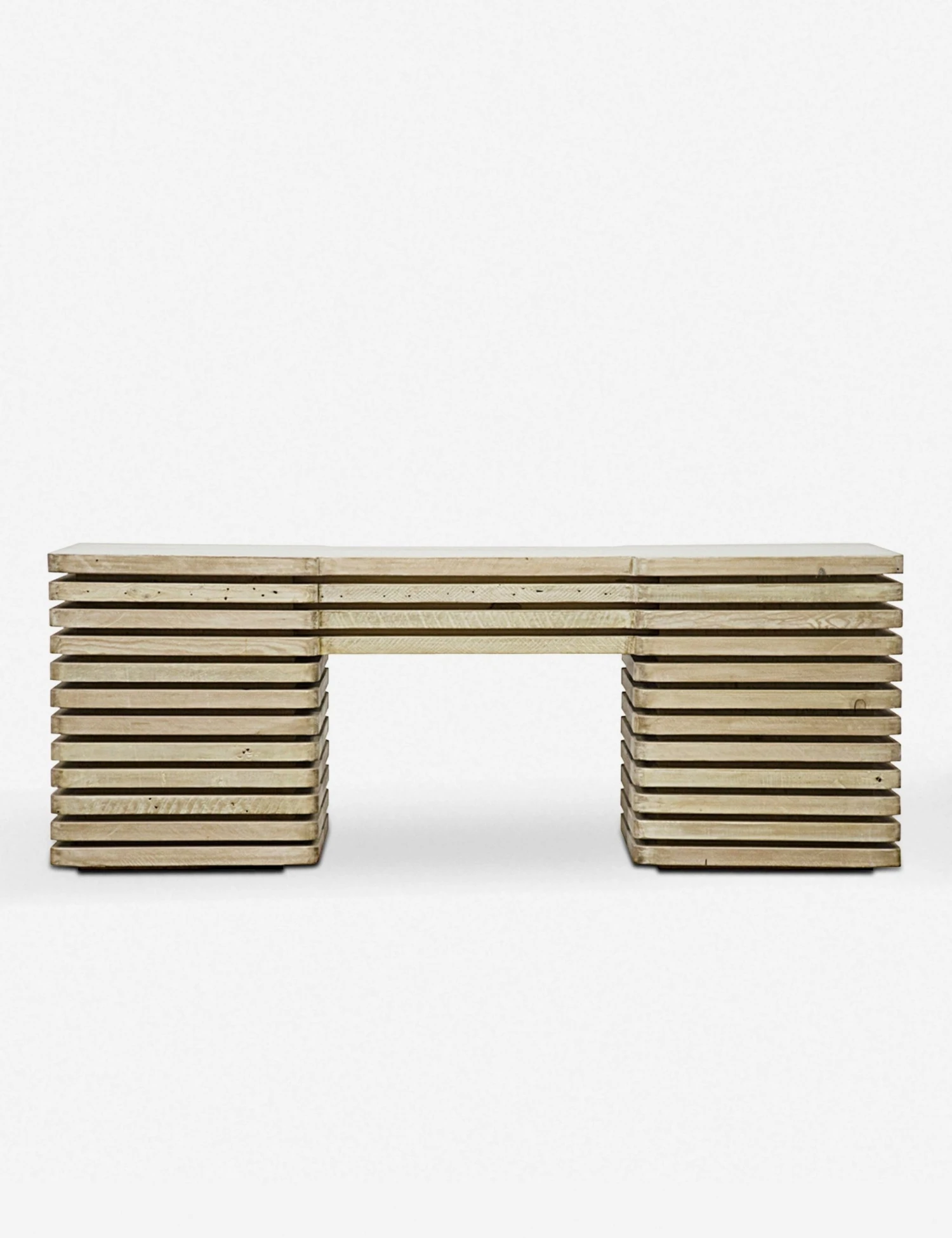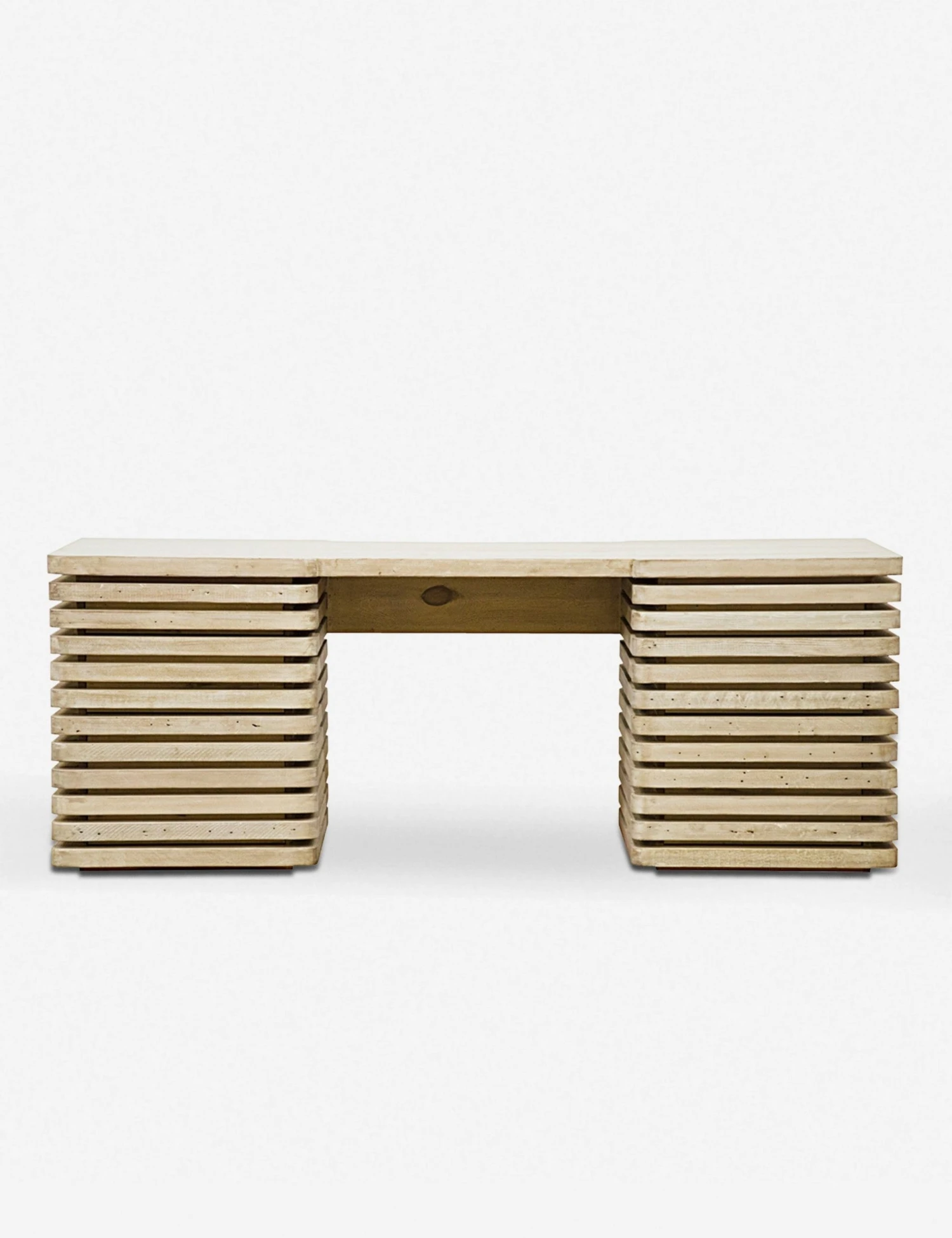 A modern aesthetic with architectural influences characterizes the Ellery desk. Stacked slats in reclaimed wood seem to float in midair thanks to the recessed base. As functional as it is unique, this piece has a total of six concealed drawers to hide clutter and keep your office looking clean and sleek.