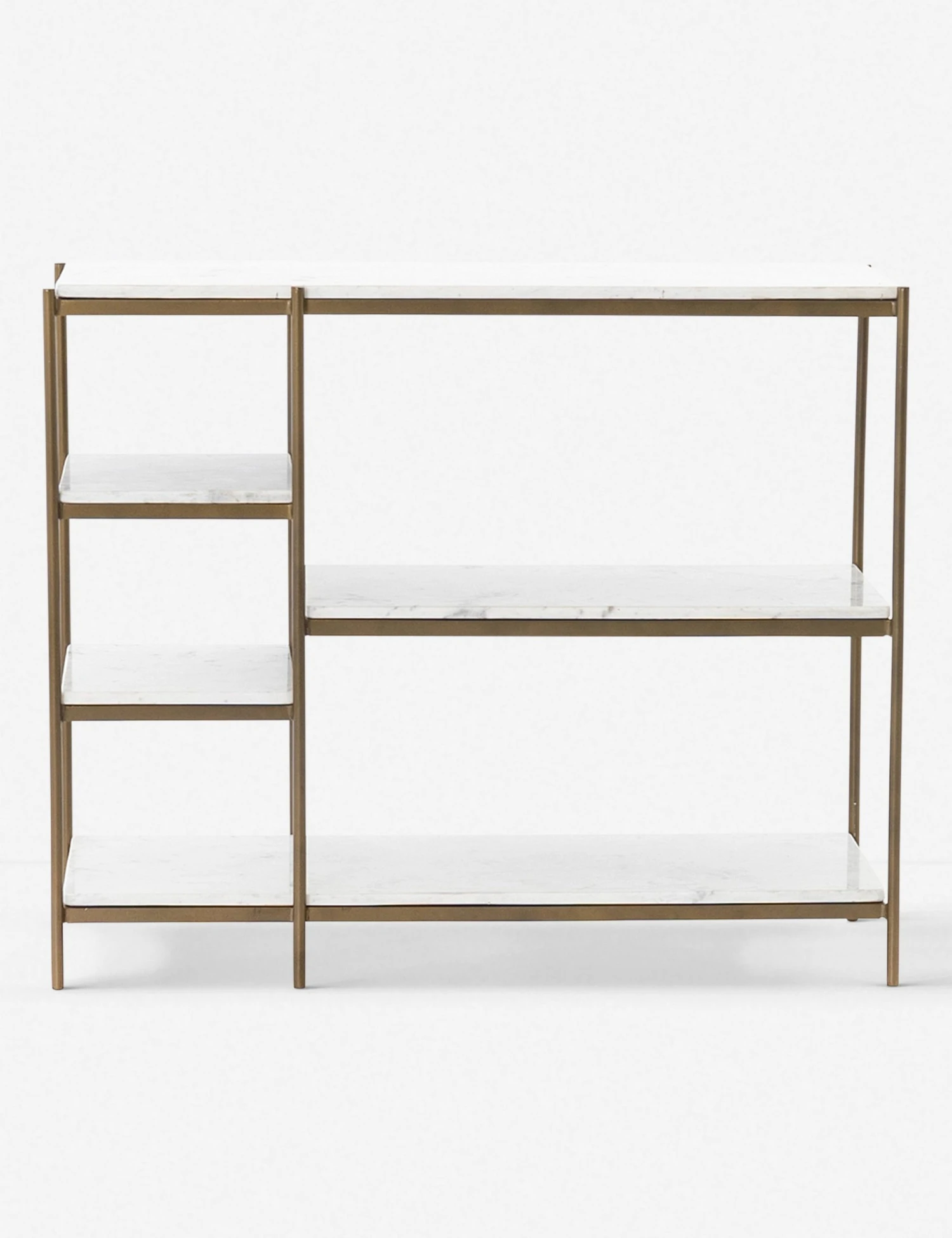 Marble shelves bring a luxe finish to this modern console table, finished with an antique-gold frame and versatile open design. Perfect for contemporary living and dining rooms.