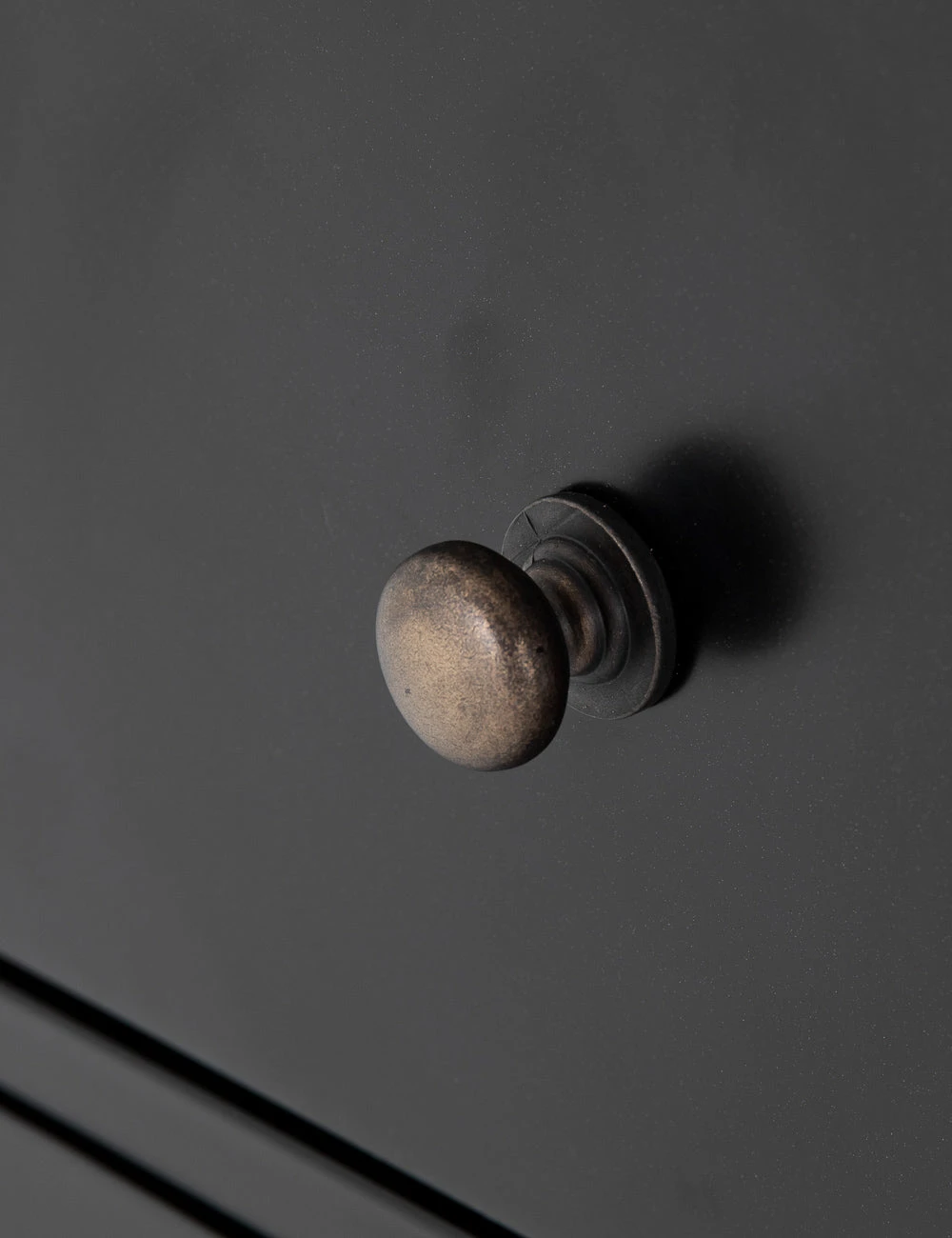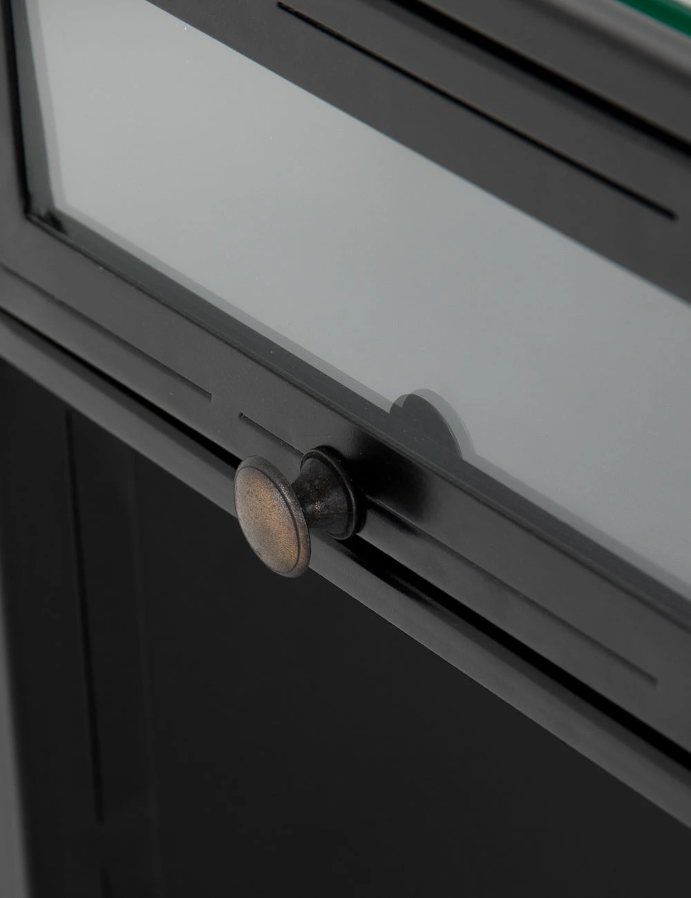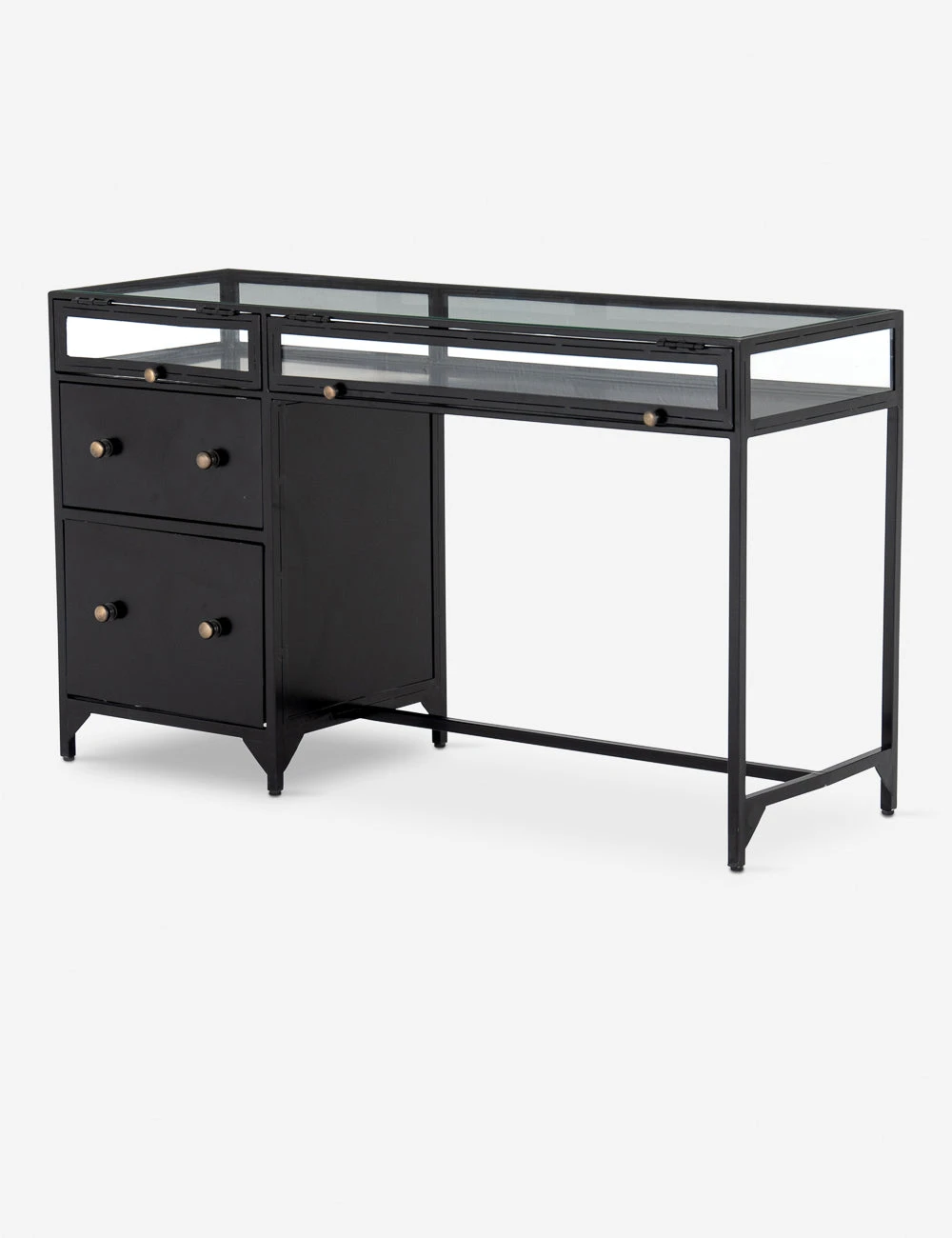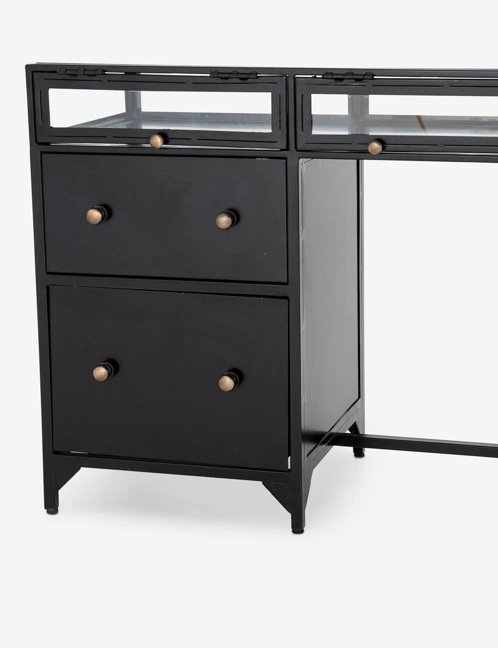 In a sleek nod to a shadow box design, this home office desk features an iron frame with glass enclosures for storage and display. The Malcom Desk includes a file drawer finished with brass knobs to offer a practical touch with an industrial edge.