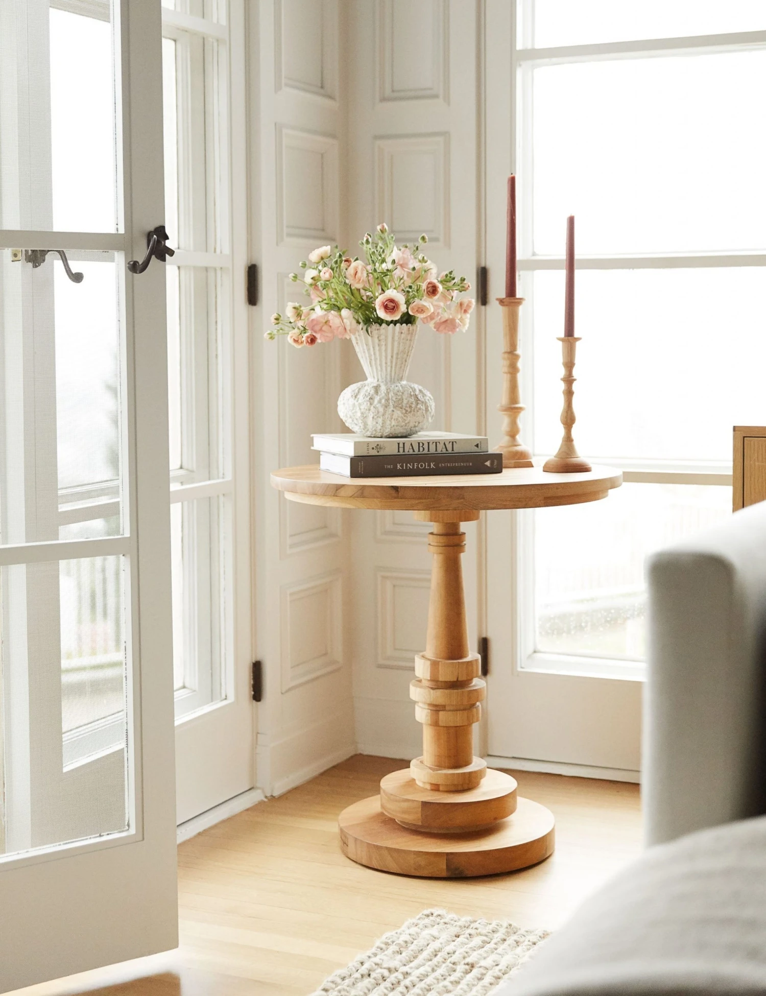 This side table features a classic turned pedestal base updated with clean lines for some contemporary style. Pair with warm colors and transitional pieces for a sophisticated yet lived-in look.