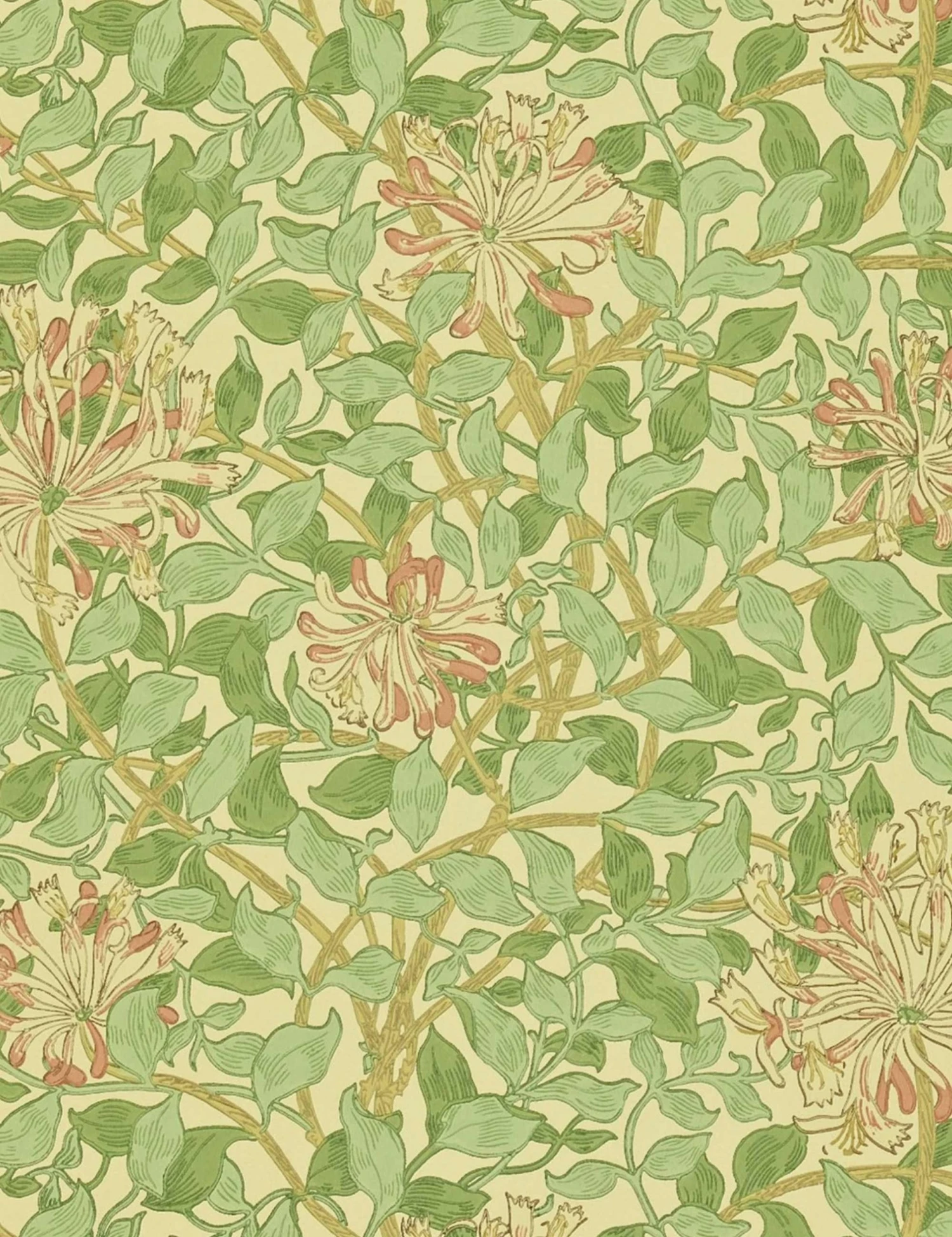 Morris & Co. Honey Suckle Wallpaper, Green Beige Pink Swatch