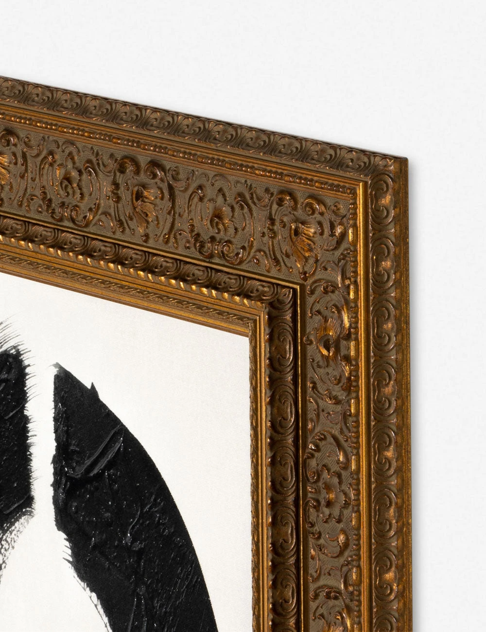 In this striking wall art series, a minimalist composition creates textural allure against a matte canvas. The ornate gold frame underscores the distinctive character of the piece, offering a signature element for richly collected wall decor.