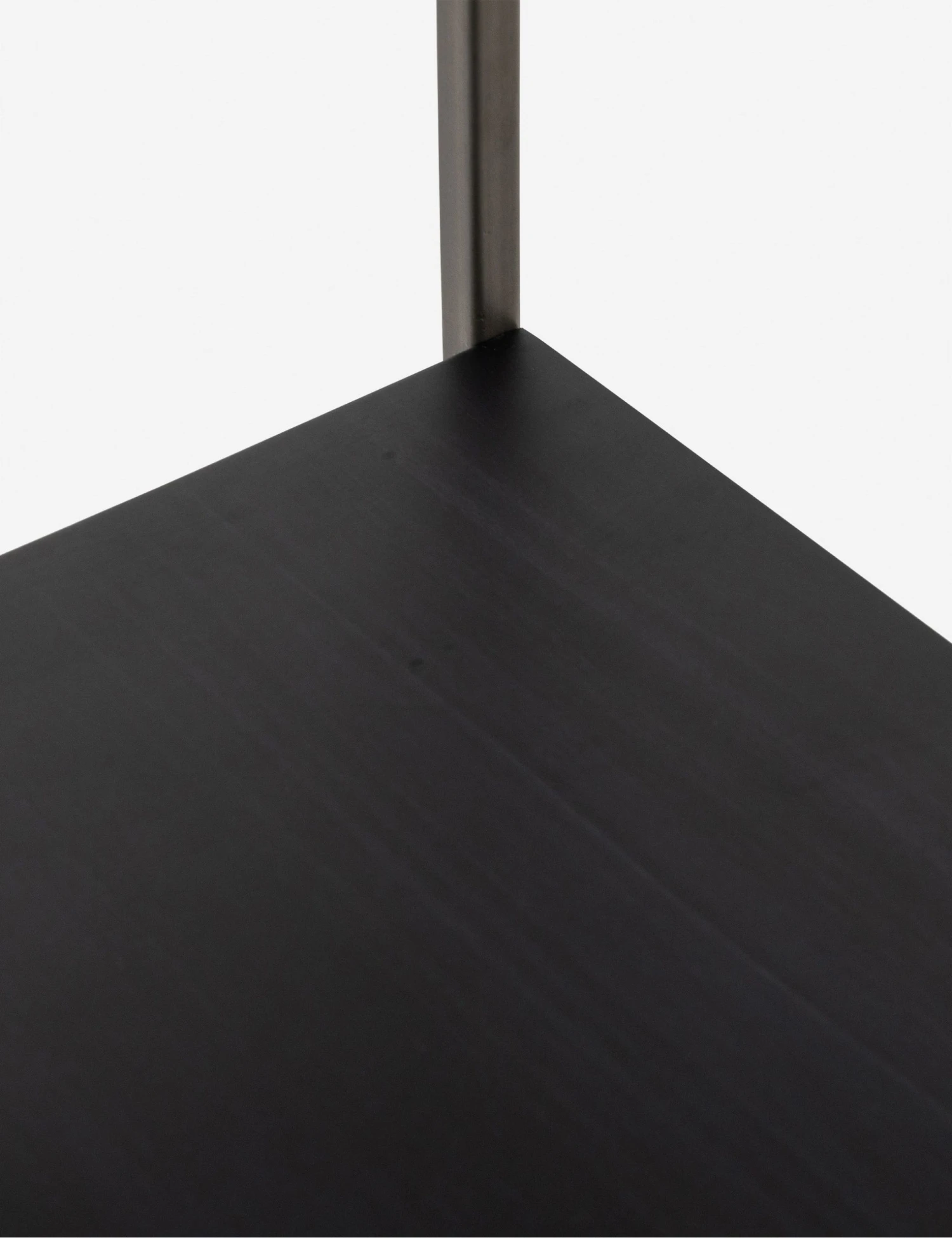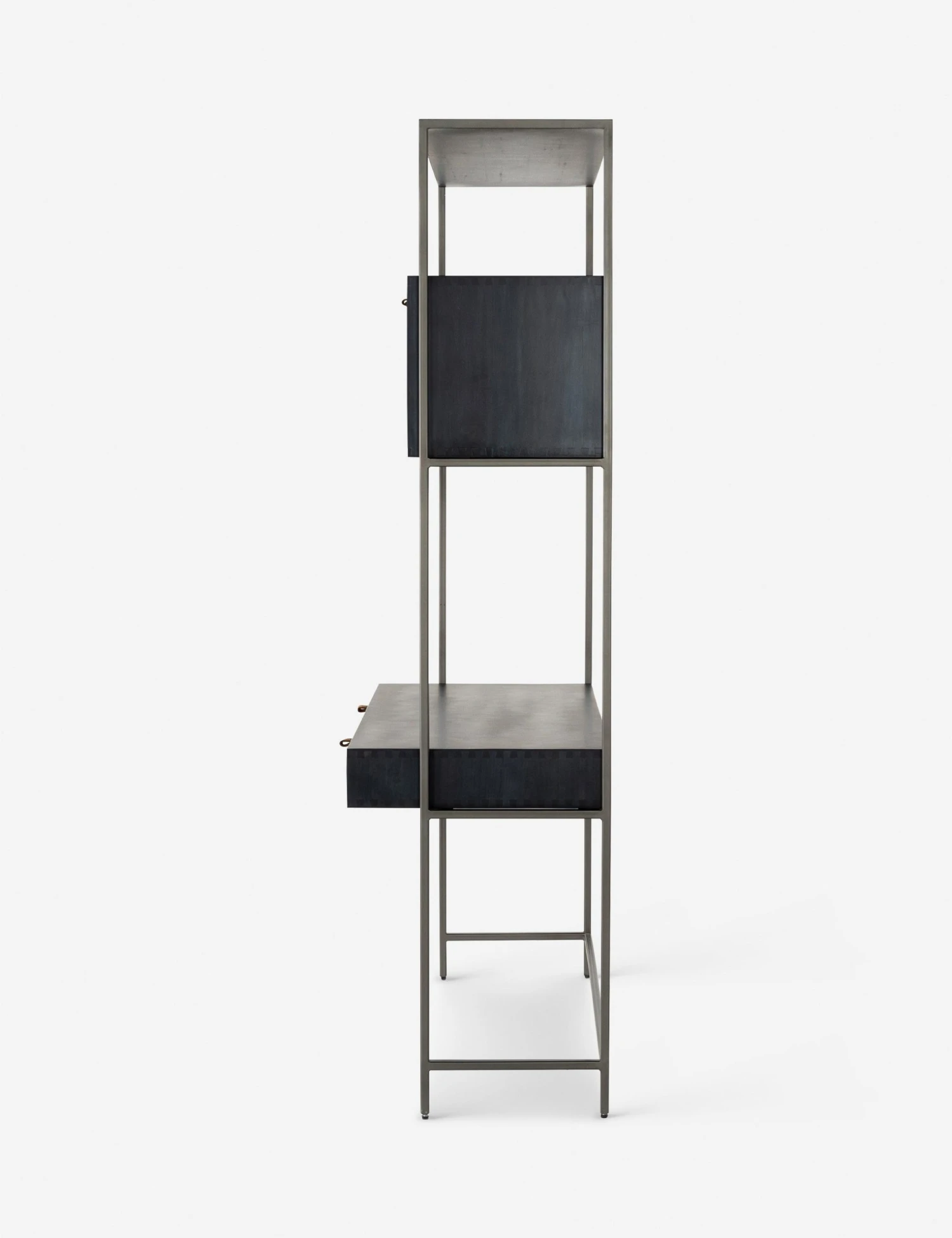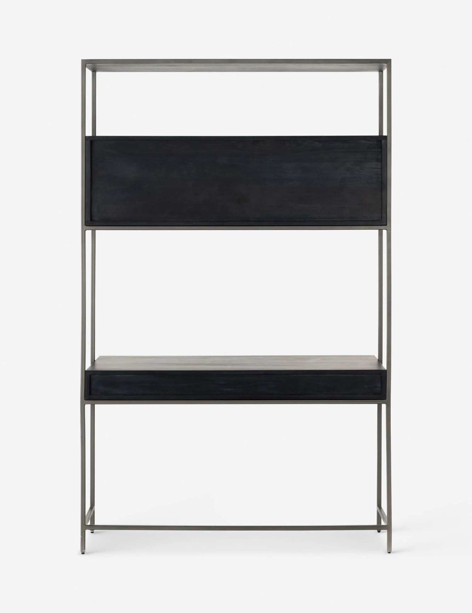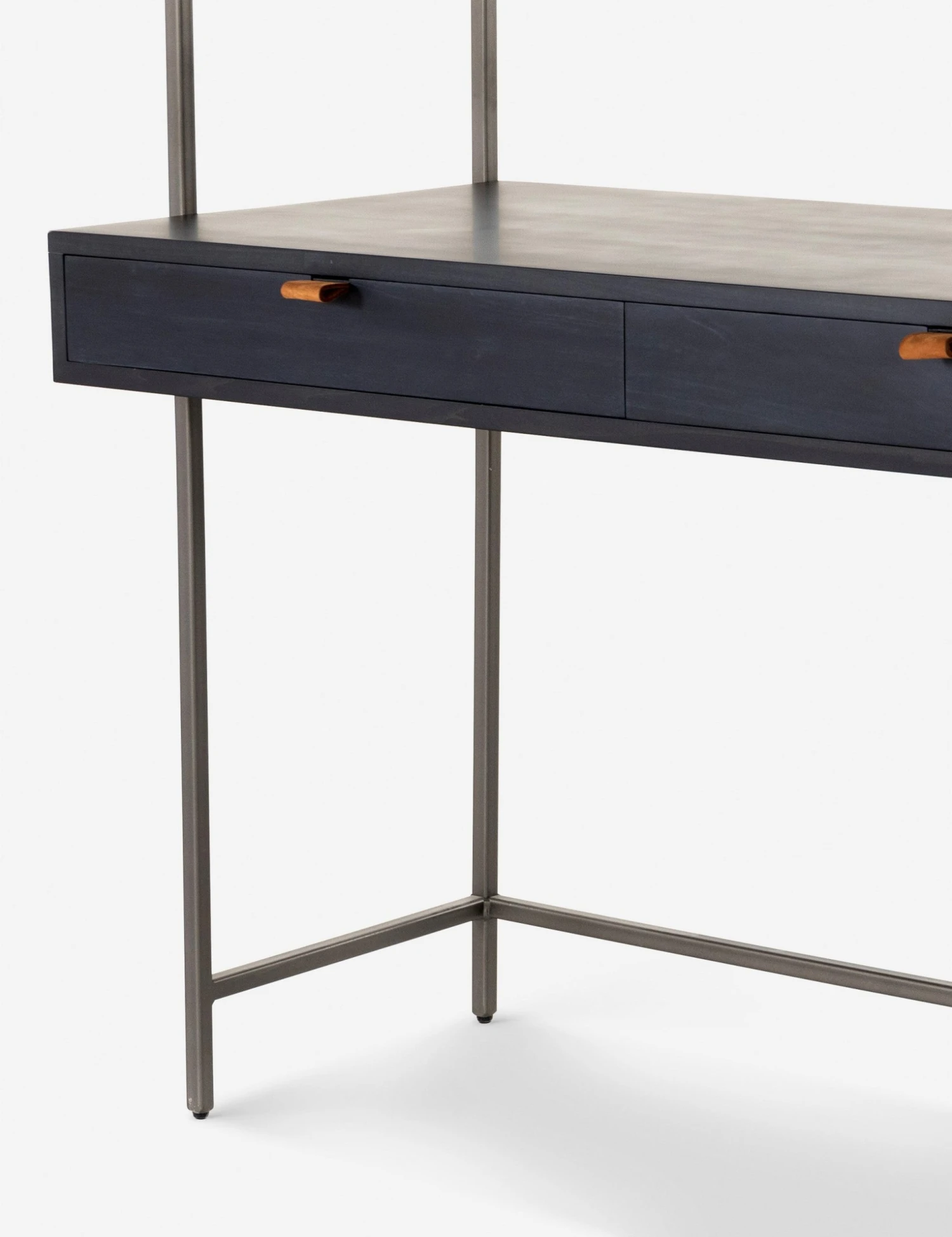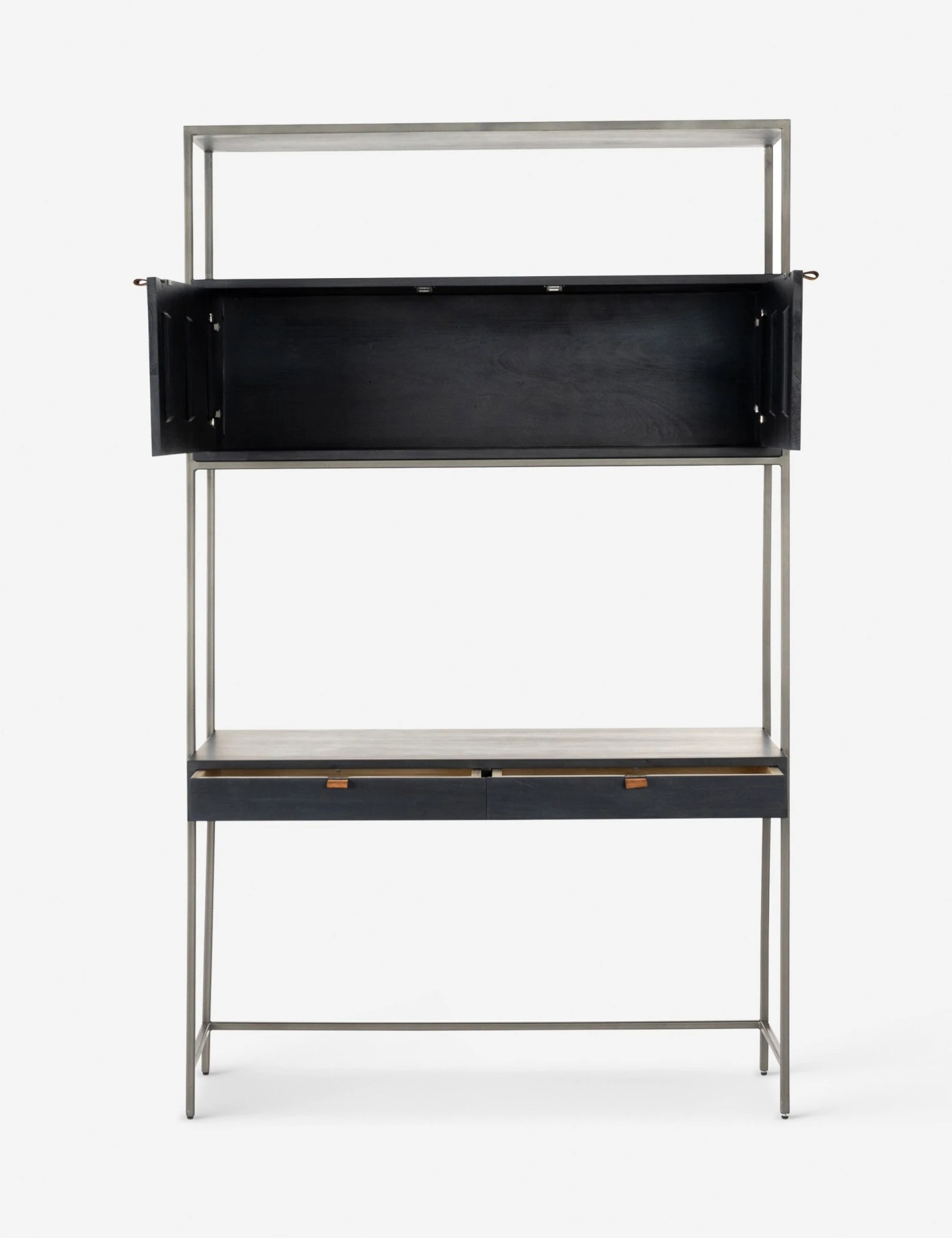 A slim iron frame lends this poplar desk and cabinet a floating look. Its dark finish, leather pulls, and modern silhouette offer a sleek desk space with plenty of surfaces and storage that can be decked with luxe decor and accents or left sparse for a touch of mid-century minimalism.