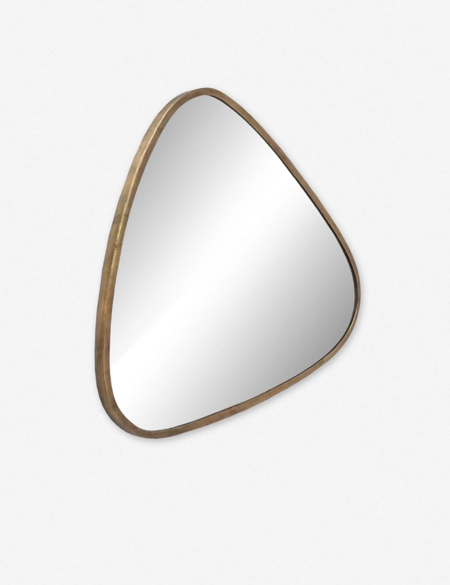 Update your bare walls with this modern mirror. Designed in a triangular shape with rounded corners and an antique brass frame, it’s the perfect way to add a little extra shine to your space.