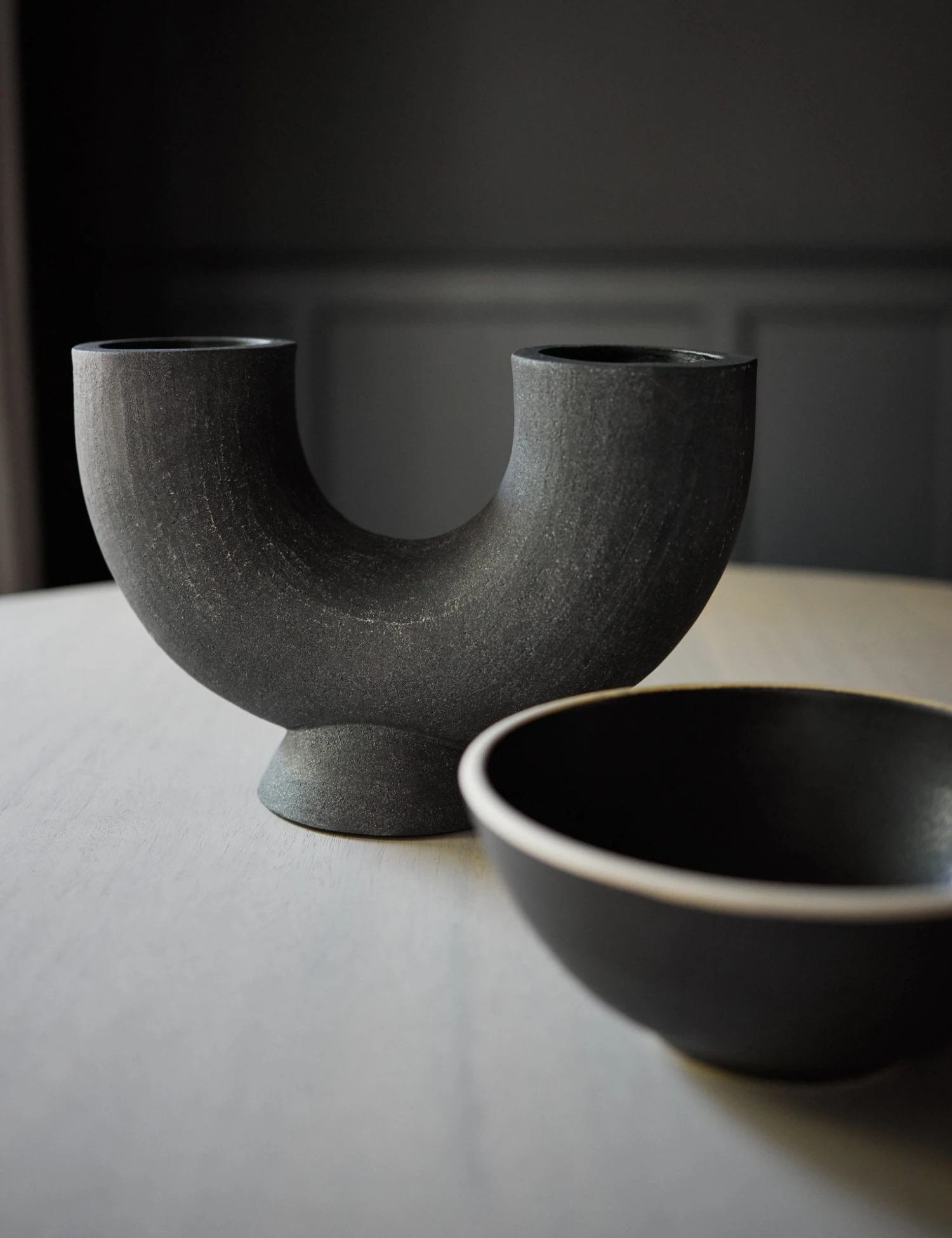 This half-circle table sculpture vase makes a modern statement with its tubular form and matte black glaze. Boasting natural terracotta textures, it’s a stunning addition to any console, coffee table, or home office.