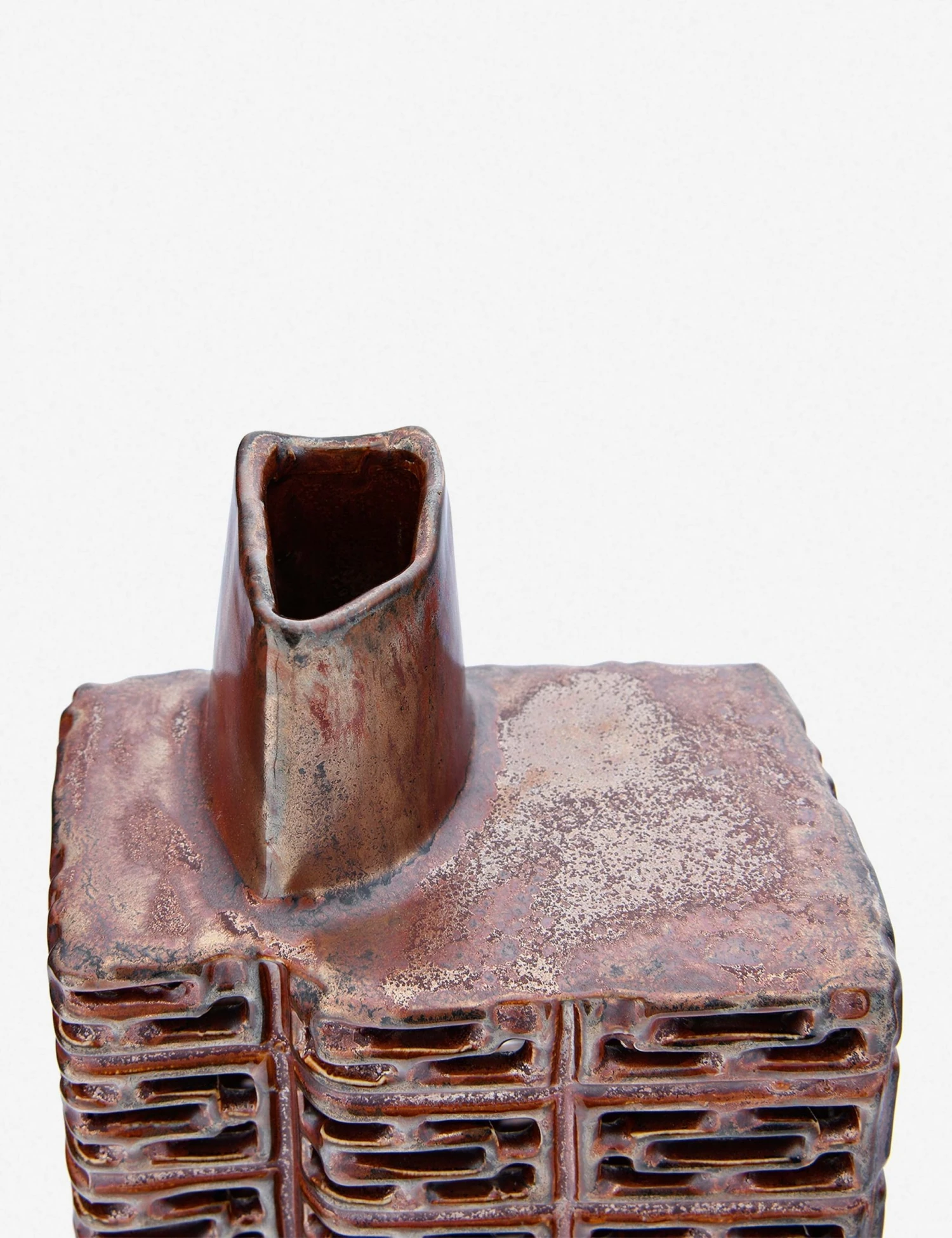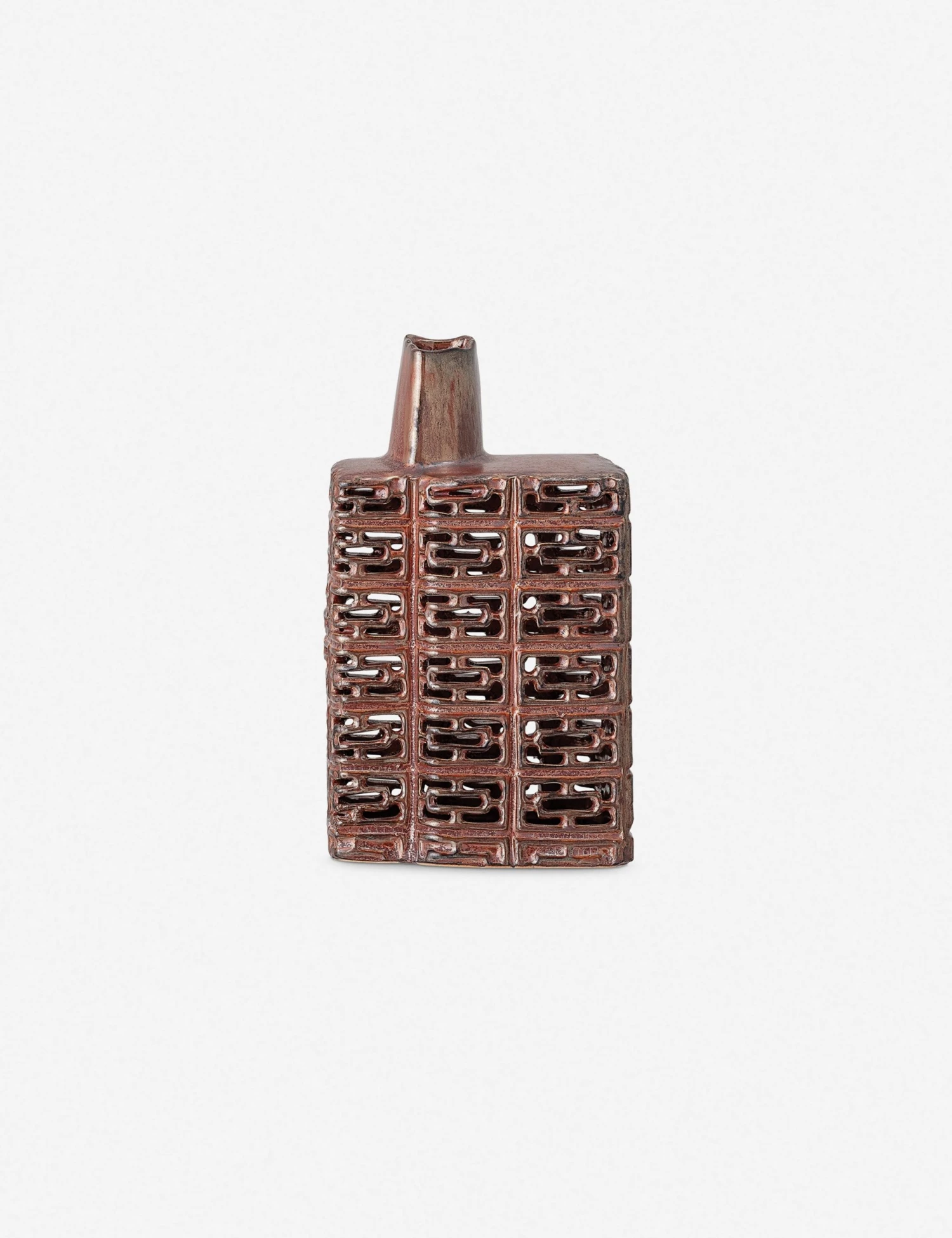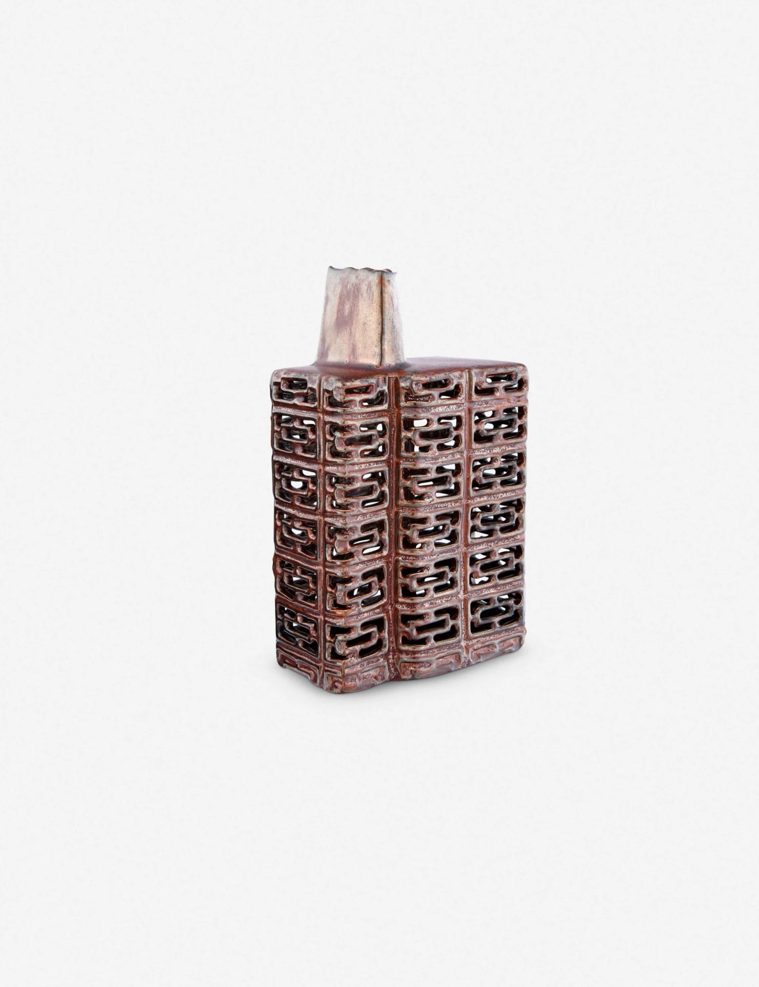 Featuring an open, carved design throughout, this asymmetrical stoneware vase brings a touch of global inspiration to your look. We love how the reactive glaze has a shiny, yet distressed finish!
